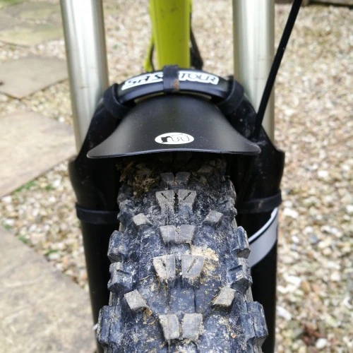 - Plasser skjermen på gaffelen, og stram de tre øverste borrelåsbåndene rundt broen først, slik at den trekker opp flush, og stram deretter de nedre armene rundt gaffelen.