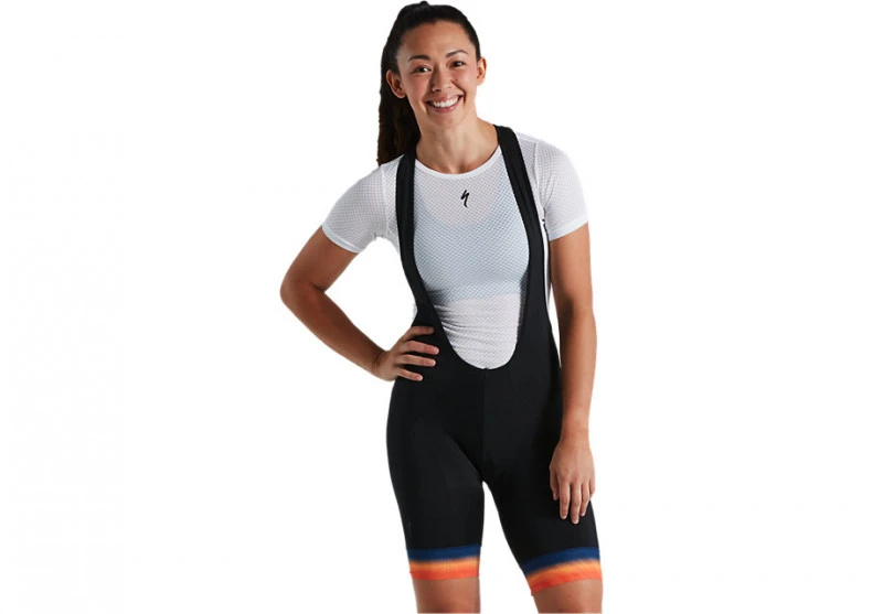 Women’s cycling bib short with anatomic design in durable Action elasthane. Body Geometry Padding.
